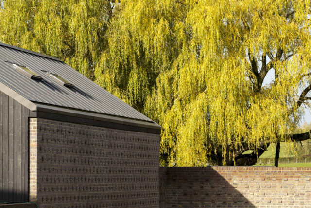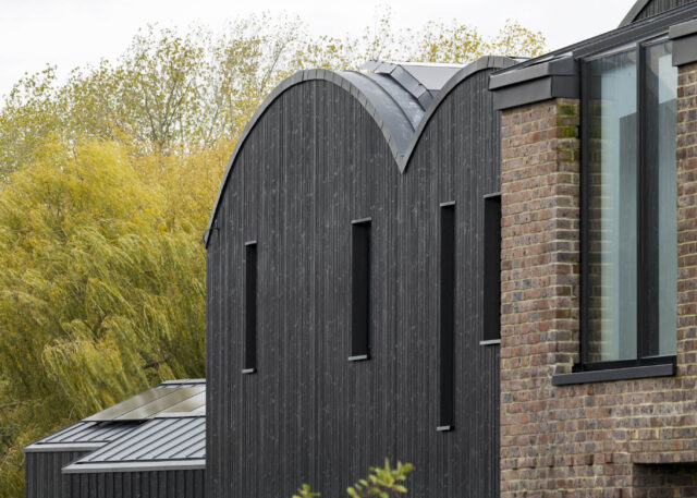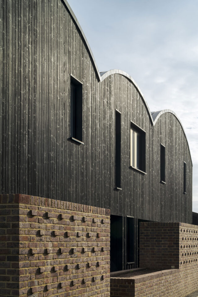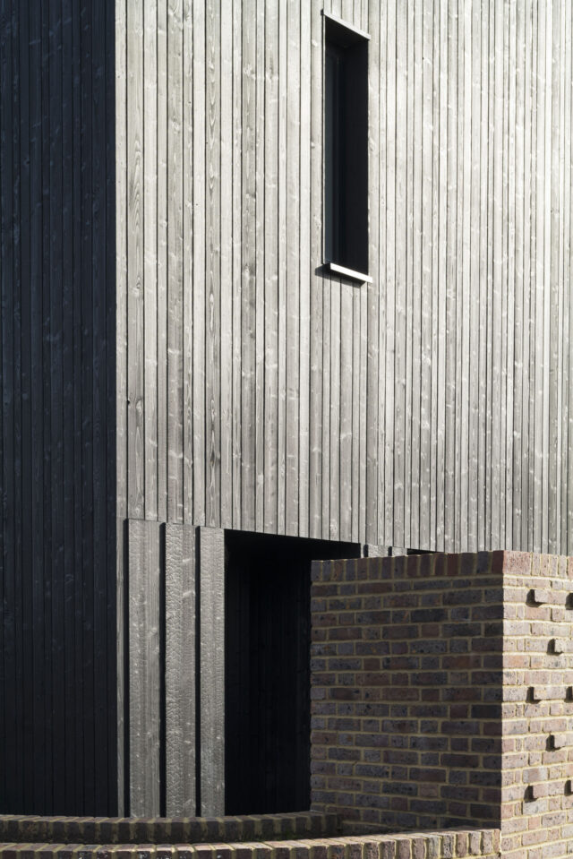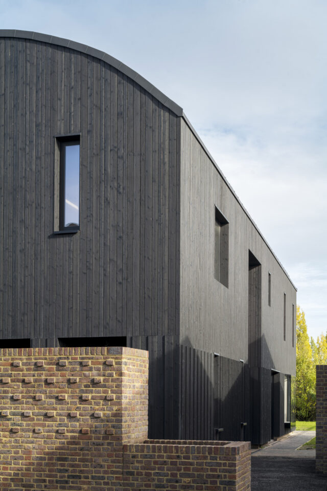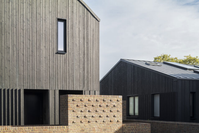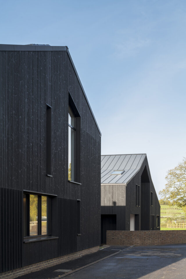 Q New Homes then appointed architects Nissen Richards Studio to develop the vision further. Nissen Richards Studio kept to the proposed building footprints but changed the buildings’ form and created new interior layouts and radically-altered exteriors, featuring darkened, charred timber and dark multi bricks rather than the pale timber originally proposed. Nissen Richards Studio then developed, amended and resubmitted the plan, retaining original structures and respecting the footprint of the original planning document, whilst conceptualising a new materials strategy.