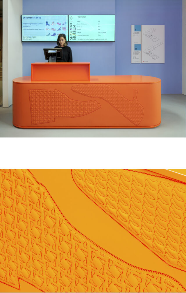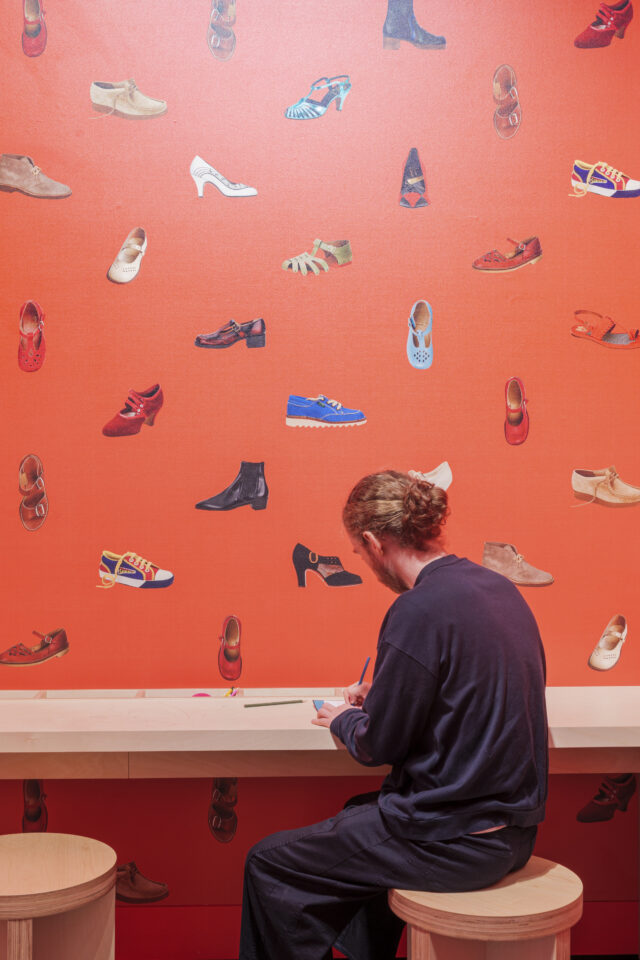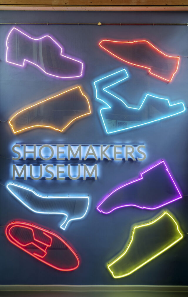 For the permanent exhibition, Nissen Richards Studio responded to the brief to create a colourful, highly graphic and vibrant exhibition environment through the imaginative communication of stories and immersive experiences which speak engagingly to many different audiences. Visitors arrive at Shoemakers Museum into a dramatic double-height space, with their journey starting in the Arrival area before moving through three main exhibition spaces: Welcome to Street / Making Gallery / Buying and Selling. The Arrival area also instantly offers visitors two ‘wow’ moments: the first a wall display featuring neon shoe outlines and the second a bespoke welcome desk clad in vegan leather and featuring embroidered shoe outlines.